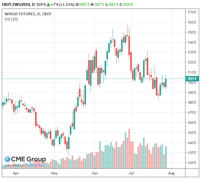* El trigo perdió algo más del 1%, especialmente producto de ventas técnicas por contagio de la situación en la plaza de granos gruesos, a pesar del retroceso en la condición del trigo de primavera y del atraso en la cosecha de la variante de invierno. El calor en Europa está acelerando la llegada del trigo a los silos.